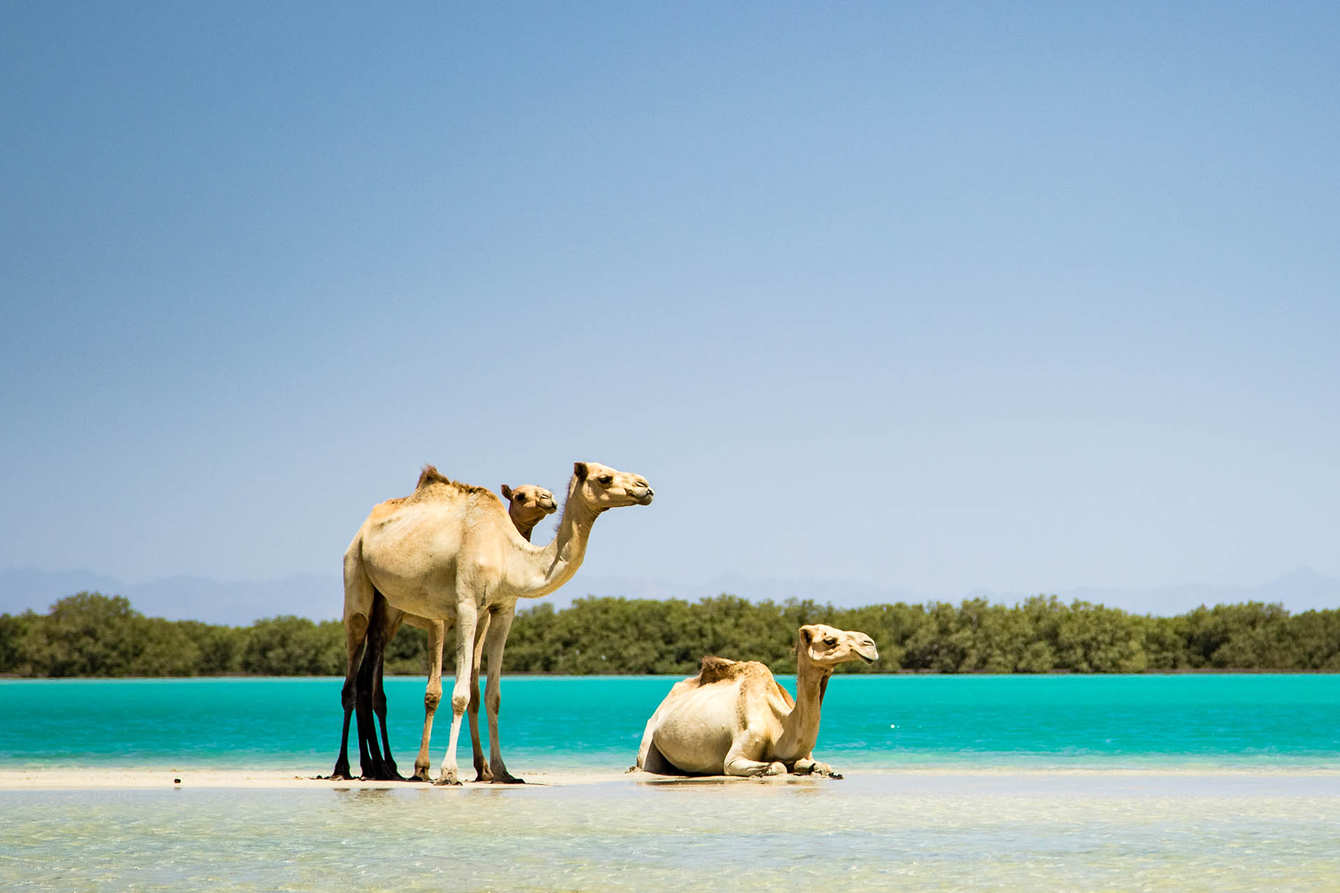 Day two, Sunday, we headed out to fish further down the flat, heading back to the Scuba for lunch. Again a beautiful clear day but the wind had dropped to eight/ten knots and the water was cold and clear. We were heading up towards a small island, linked by a sand bar and behind which the water was a stunning turquoise. Munching the trees on the island was a family of camels and the night before Mark had said that he would love a shot of a trigger landed with the camels in the background. I sent Geoff off with Fede to fulfil Mark’s photo request. Mark meanwhile had wandered up towards the camels. They were moving down the sand spit with the smallest camel splashing and playing and trying to get Mum to join in the fun. Eventually, worn out, it slumped onto the sand and the rest of the group followed, staying in their mother/child pairings and settled in to watch these strange creatures waving sticks in the air.