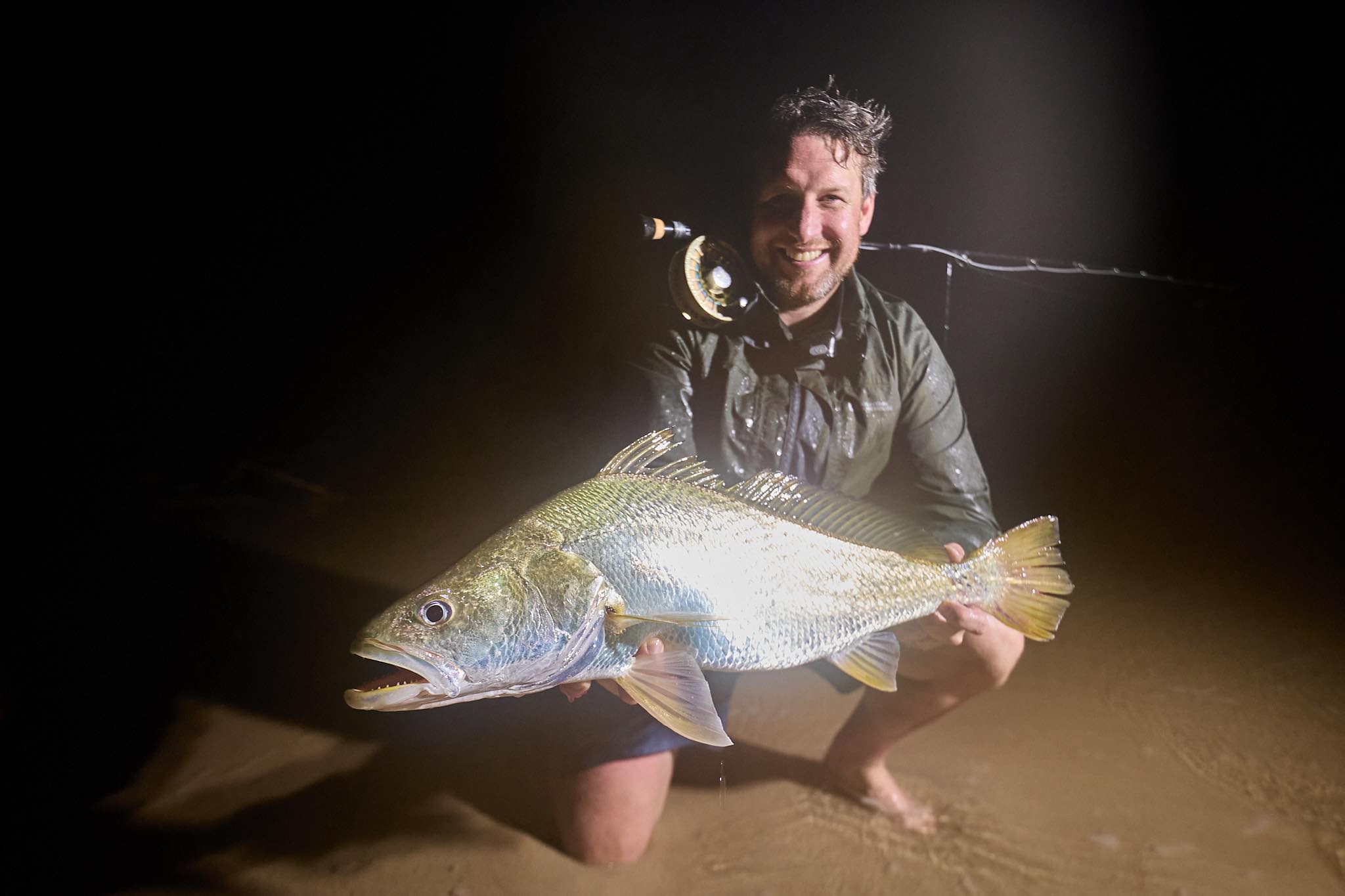 Fly-fishing after dark was no easy task, but Mike’s commitment stood out. He barely took a break and was rewarded with several kob on fly, a strong Cubera snapper, and even a jumped tarpon in big surf and strong wind. Some decided to abandon the fly rods altogether, preferring to swim live mullet instead. Every day we stray further from God. That move paid off with Cuberas around the 10 kg mark, a solid kob for Christin — the only lady in the group — a small bull shark, and a few sand sharks that kept Nigel, the oldest and most enthusiastic angler, entertained.