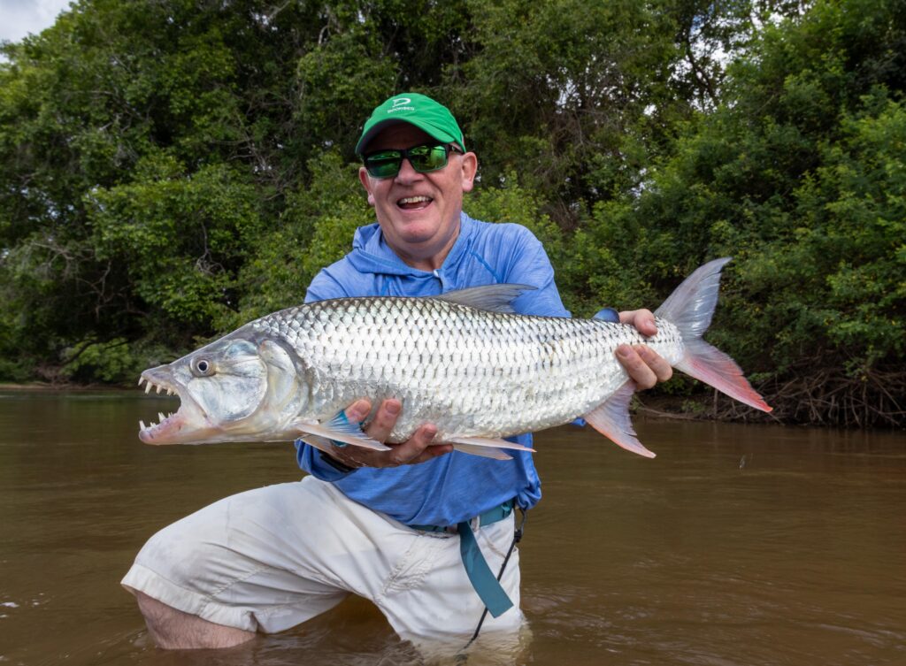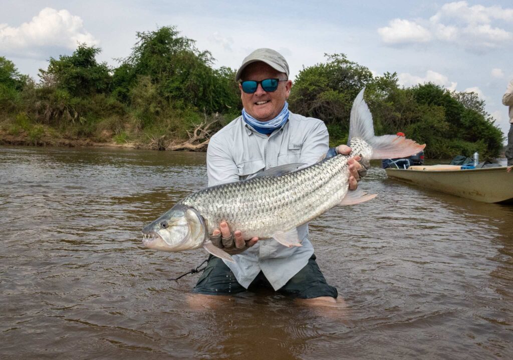 Mark and Riley spent a day exploring upriver and found themselves at a stretch known as Double Up. They’d already had a few smaller fish when, right against the bank, the river erupted. Line screamed off the reel as Mark held on, and after a tense fight, a beautiful 14-pound tigerfish came to the net. Landing one of that size on foot in such wild surroundings is always something special.