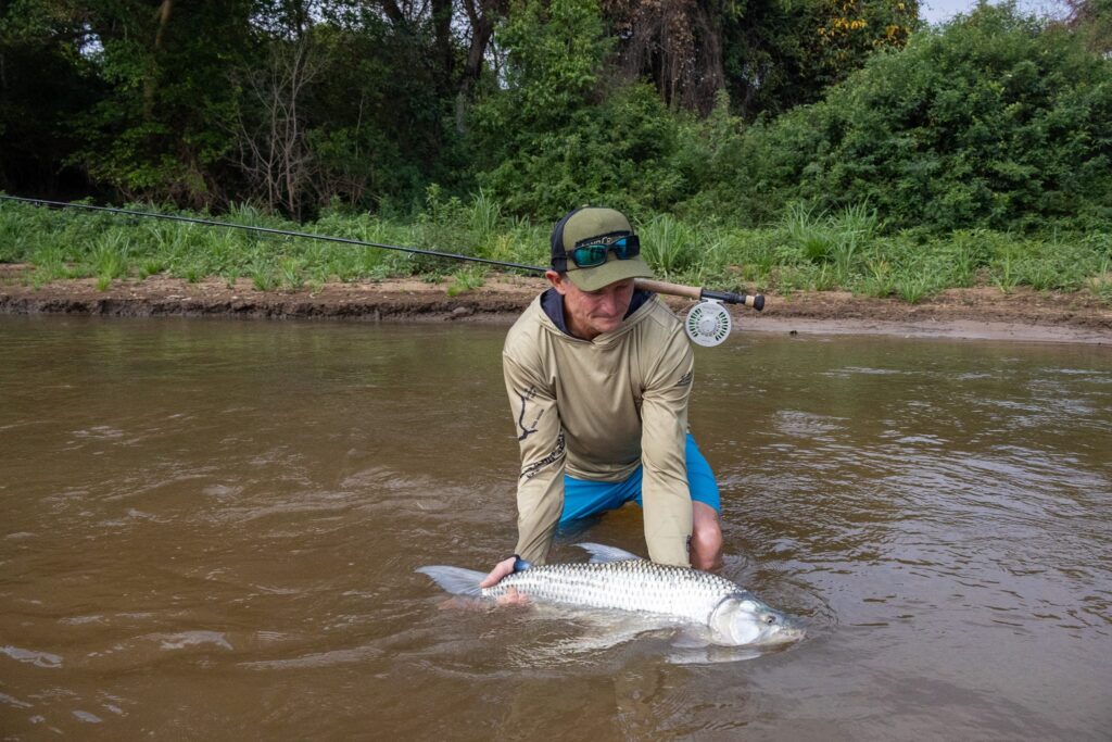 The next eat was unmistakable. The fish moved hard across the pool, jumped several times, and pushed both angler and guide into full concentration mode. After a steady fight, the net went under a broad-shouldered tiger weighing 23 pounds. A memorable fish and a fitting way to close the week.