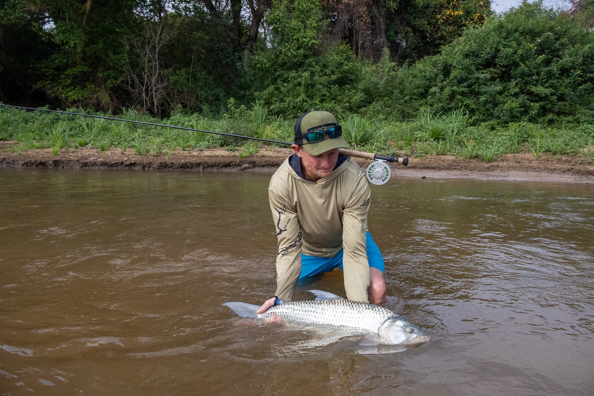 Early in the week, Doc Mac delivered a cast between two tight logs on the upper Mnyera. Two strips later he was in. The fish wrapped itself around branches immediately, and the calm morning shifted into organised chaos. We pushed the boat into the timber, Doc traced the line back through the sticks, and to our surprise the pressure returned.