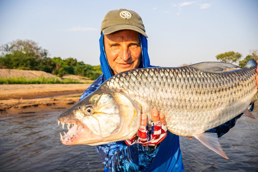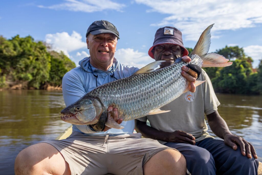 What followed was controlled chaos. Two anglers, two powerful fish, and very little room for error as lines crossed and fish changed direction. Somehow, both tigers ended up in the net. Seeing two of these fish side by side never gets old, no matter how many seasons you’ve spent here.