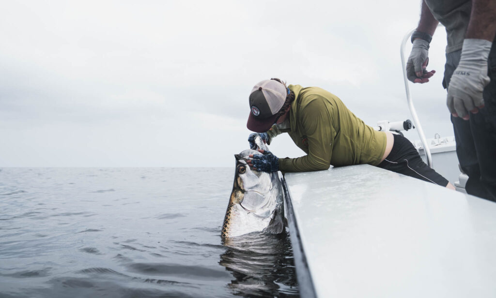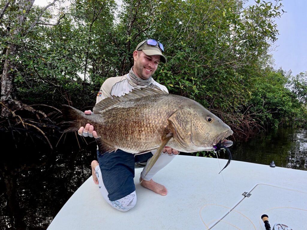 The tarpon jumped repeatedly before ripping close to 100 metres of backing from the reel. After settling deep, the fish demanded steady pressure and patience, surfacing periodically to breathe and showing just how much stamina these fish have. Just under an hour later, we had hold of a magnificent 150-pound tarpon. Measurements and photos were taken quickly, and the fish was revived and released strong.