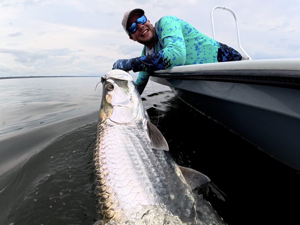 Garth’s contribution to Catch of the Week came the following day and ended very differently. Chasing a string of rolling fish, the take came right at the boat with the leader inside the rod tip. In the chaos, the tip section was torn off, reattached on the fly, and the fight carried on. After an hour and twenty minutes of steady pressure, long runs and repeated jumps, we brought a broad-shouldered 150-pound tarpon alongside the skiff. Quick photos, careful handling and a strong release rounded off a hard-earned win.