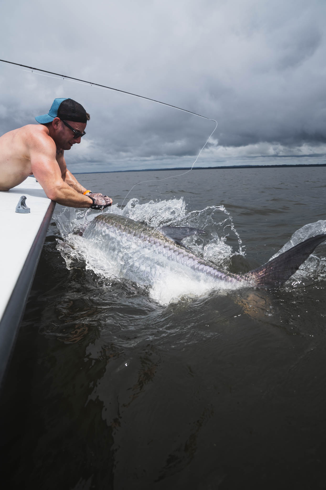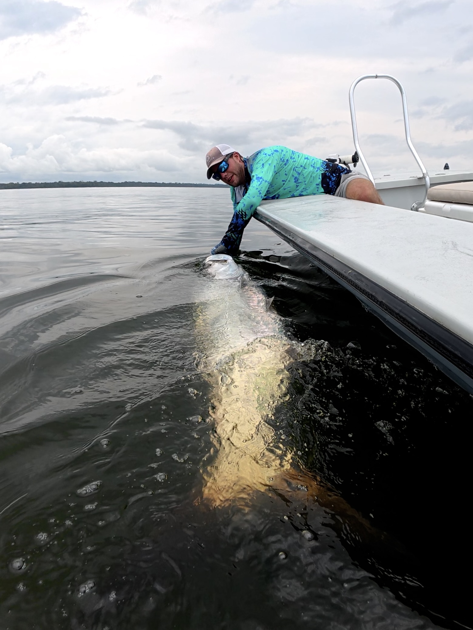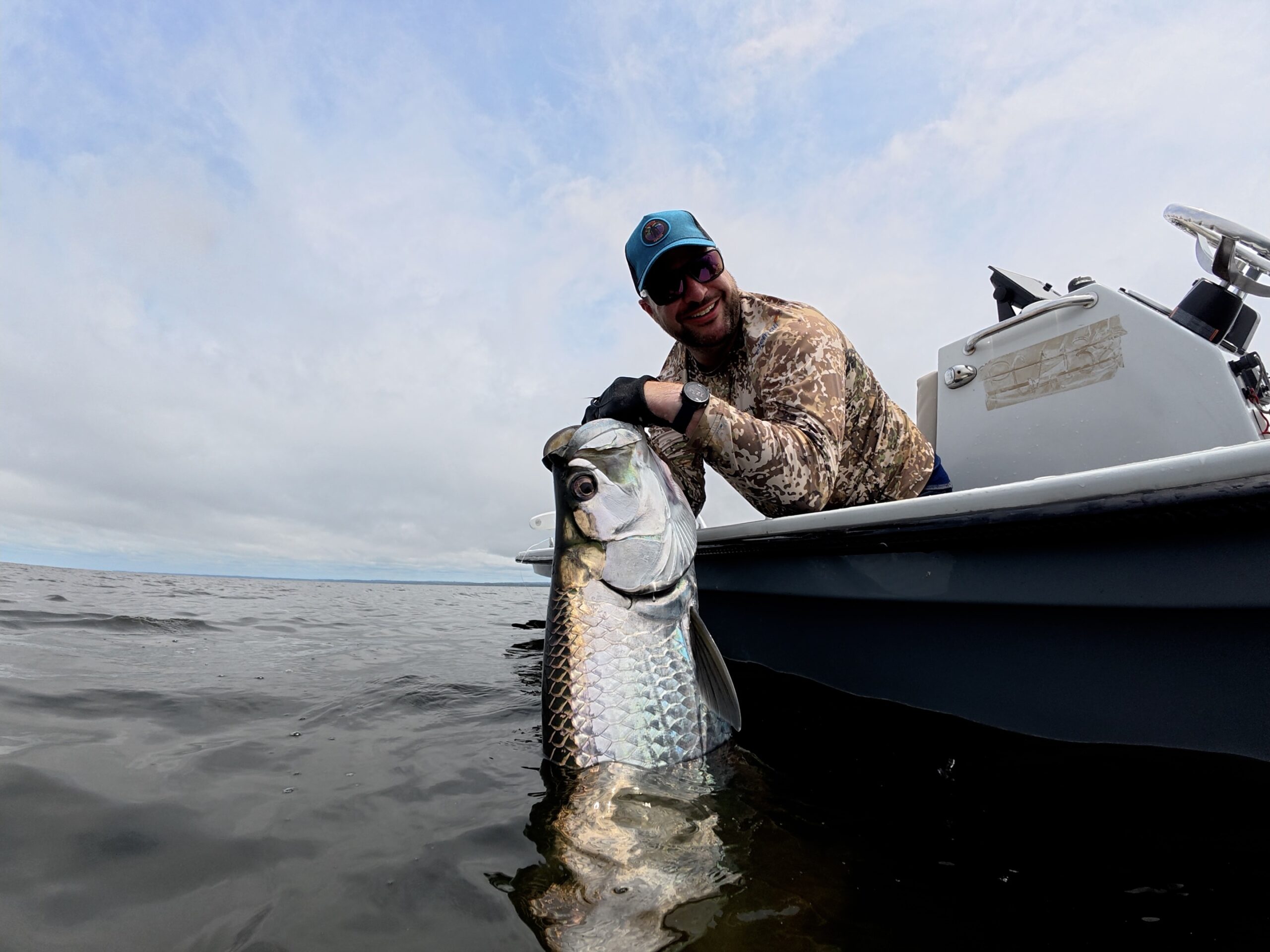 Garth’s contribution to Catch of the Week came the following day and ended very differently. Chasing a string of rolling fish, the take came right at the boat with the leader inside the rod tip. In the chaos, the tip section was torn off, reattached on the fly, and the fight carried on. After an hour and twenty minutes of steady pressure, long runs and repeated jumps, we brought a broad-shouldered 150-pound tarpon alongside the skiff. Quick photos, careful handling and a strong release rounded off a hard-earned win.