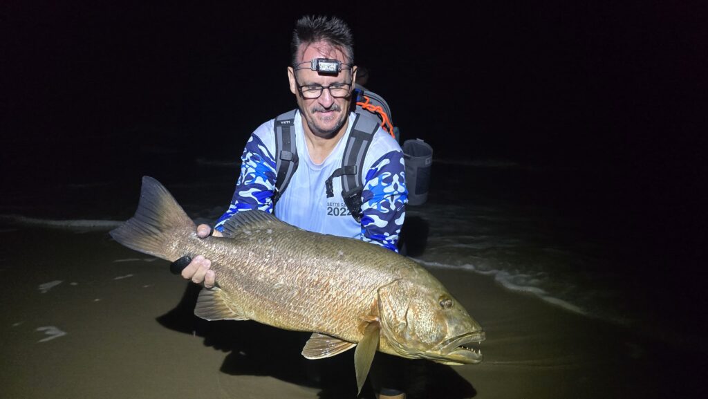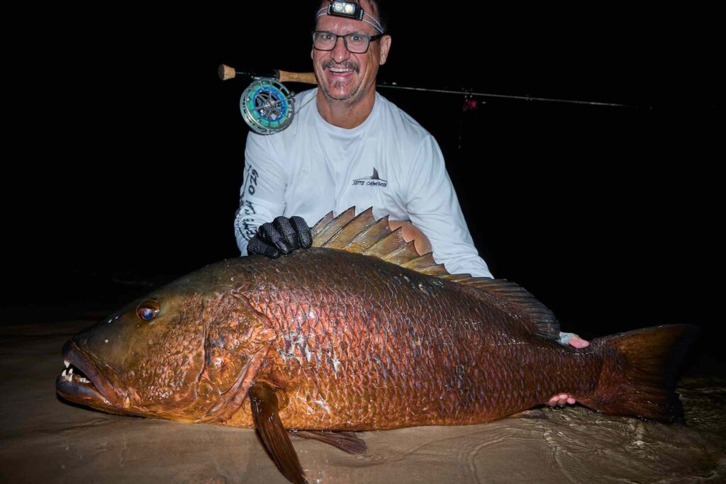 African cubera snapper was the phrase on everyone’s lips this week in Gabon, even if not everyone knew it yet. A mass migration from the lower Albany area of the Eastern Cape arrived in a familiar cloud of laughter, beer, and voices all sounding suspiciously like Ed Truter. Many of the group were anglers I had fished with before in the Transkei, others I have guided or worked alongside in past seasons. Predictably, there was confusion when fly reels appeared. A KP with a drag raised eyebrows. Spinning rods with grinders and braid were viewed with a mix of suspicion and quiet concern before being cautiously accepted. It was clear early on that this was going to be a week of firsts.