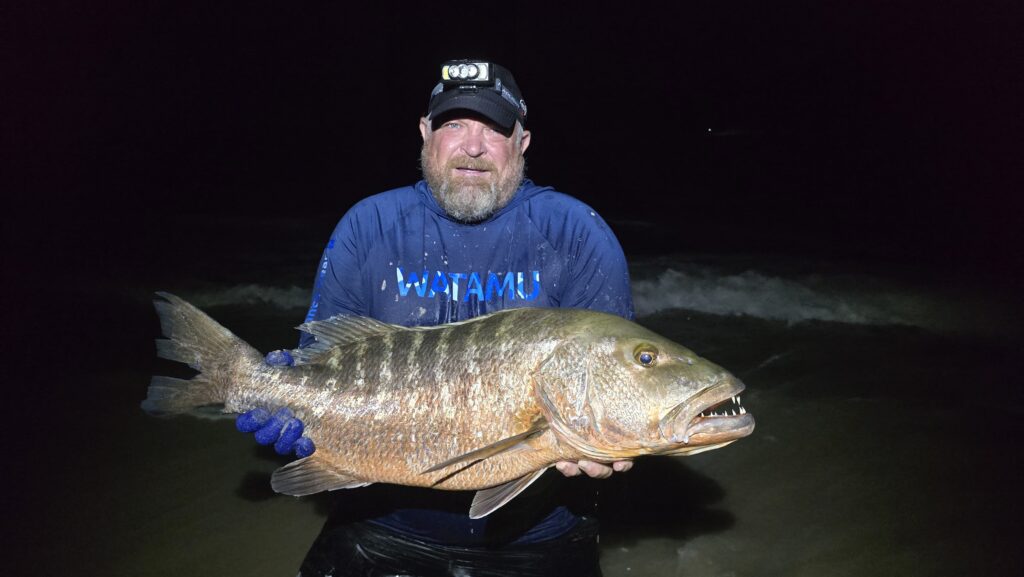The African cubera snapper fishing this week was exceptional. The average fish from the river mouth was probably around 10 kg, and we landed four fish estimated over 30 kg. Two of those were likely in the upper 30s. One of the stand-out fish was taken on fly by AJ, known to most as The Uncle, and a long-time friend of African Waters. Watching a fish of that size come to hand on fly, then power away, drenching everyone nearby, was something special.