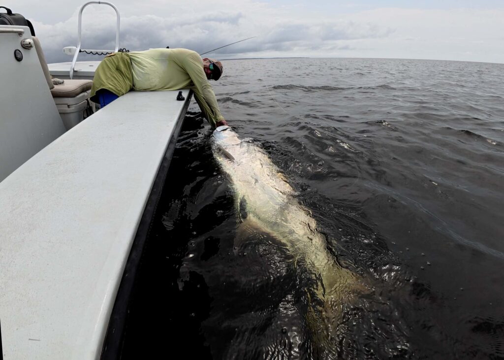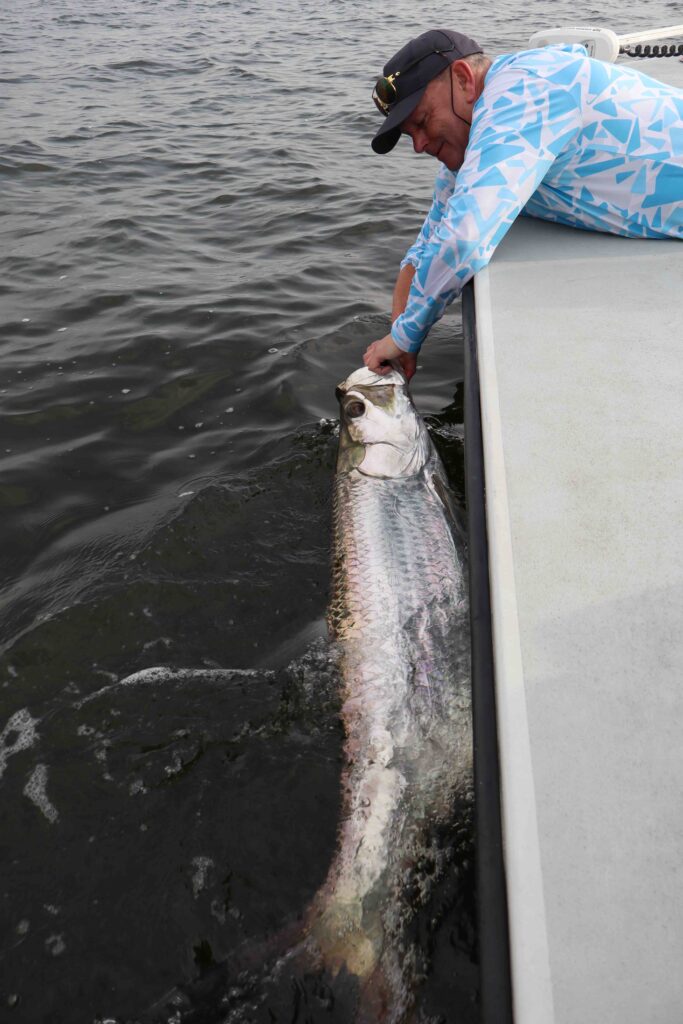 Thirty minutes later, she landed a beautiful tarpon of 115lb. Her first.
