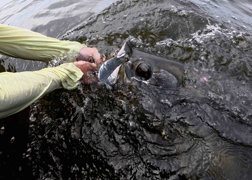 Doug and Richard each capitalised on their opportunities, putting solid fish on the deck in what were far from easy circumstances. John extended his stay by a day and was rewarded with his biggest tarpon of the trip, in the 115 to 120lb class. Staying patient mattered.